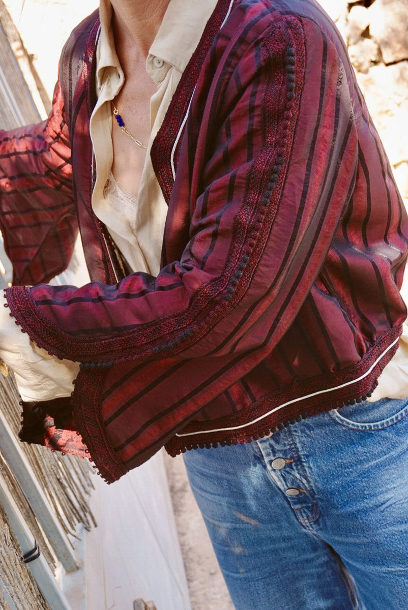 Meet your new headliner: this striped burgundy and black cropped jacket isn’t just clothing—it’s a statement. Crafted from a crisp, structured material that practically screams "rock and roll," this piece is here to add some serious attitude to your wardrobe.