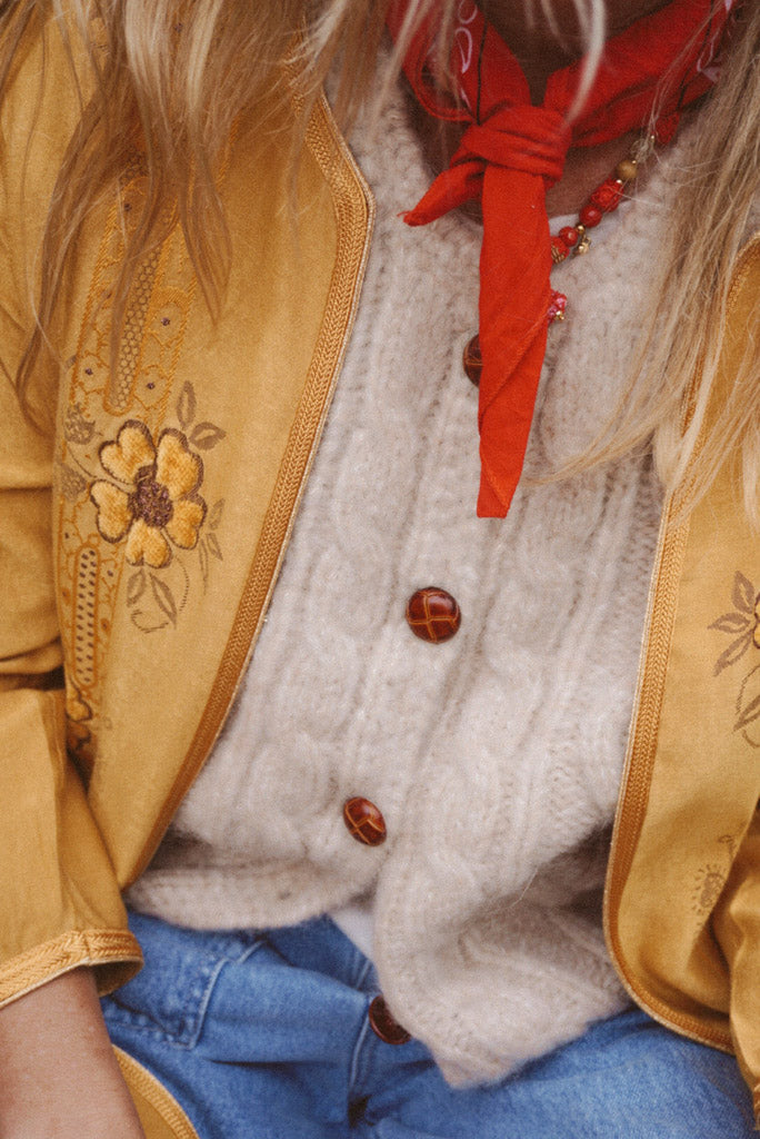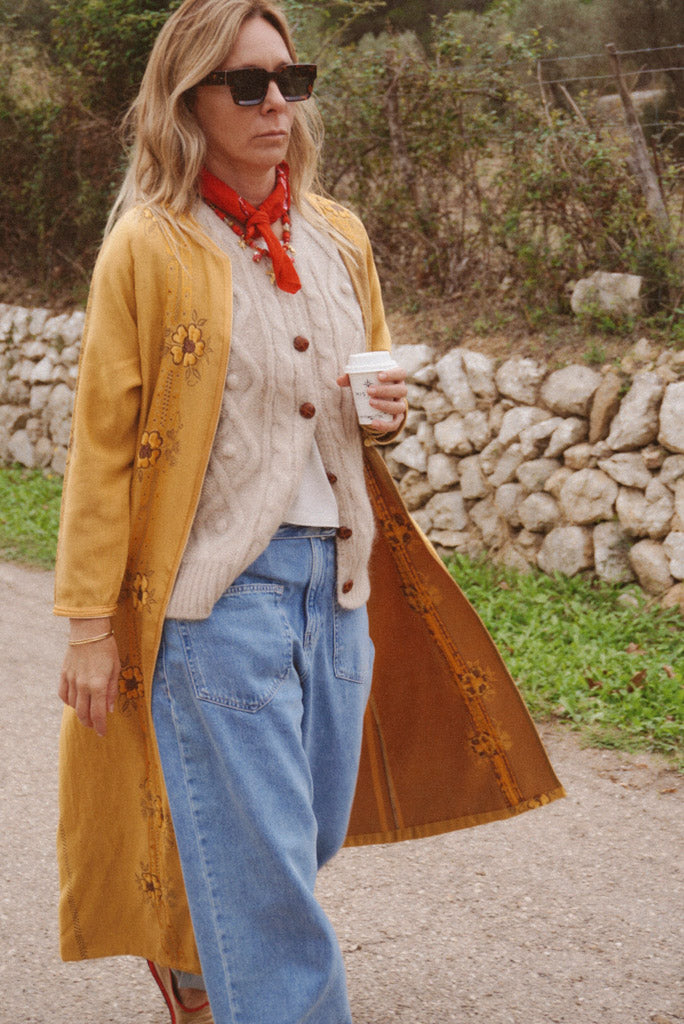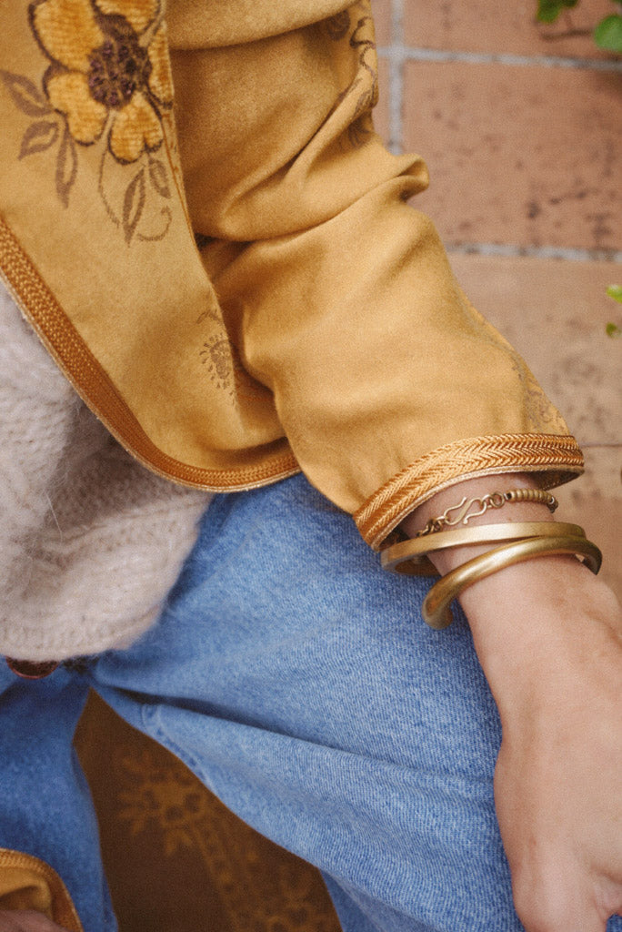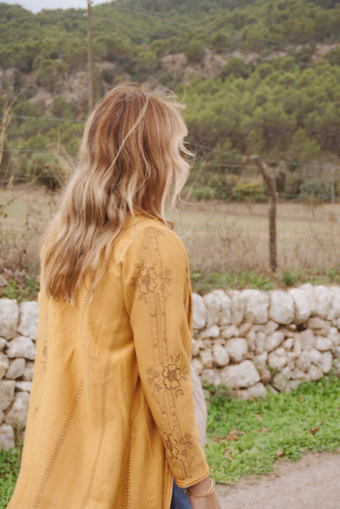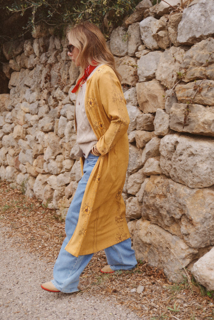 Made from a preloved mustard-yellow djellaba with floral details in warm brow and gold tones. The fabric has a soft texture and an easy drape.