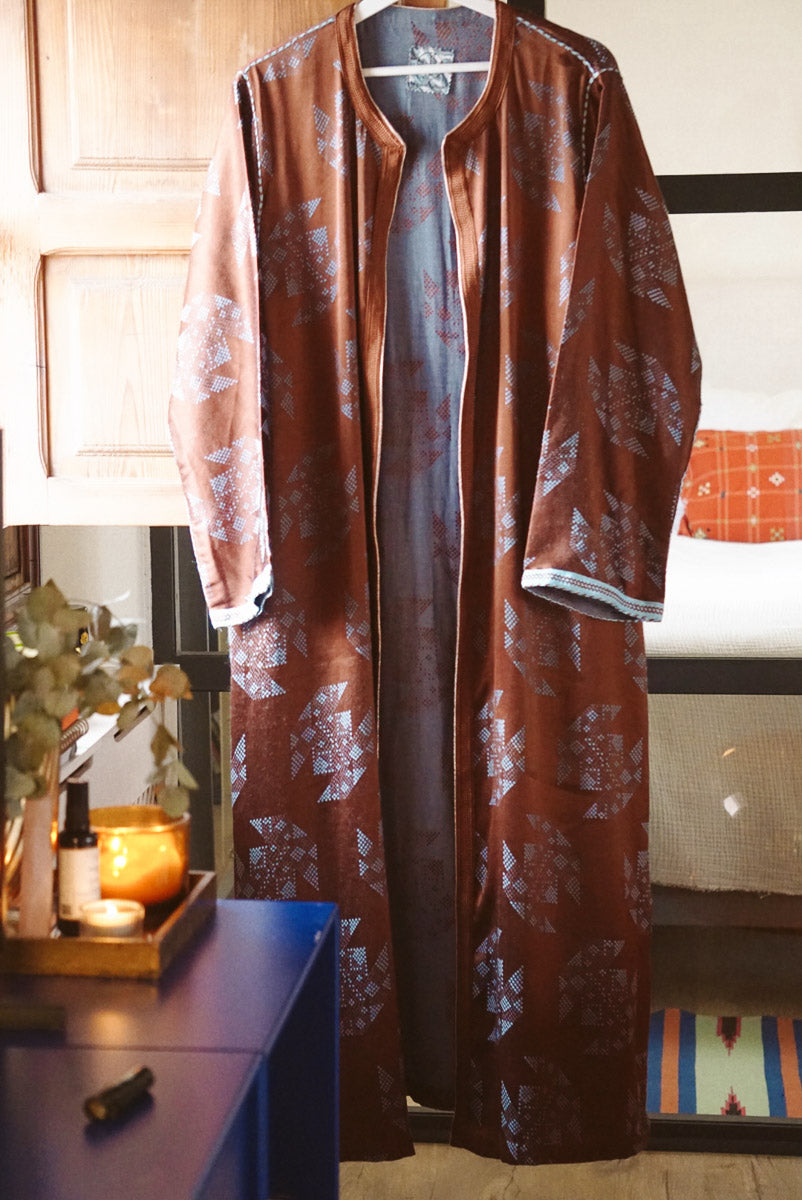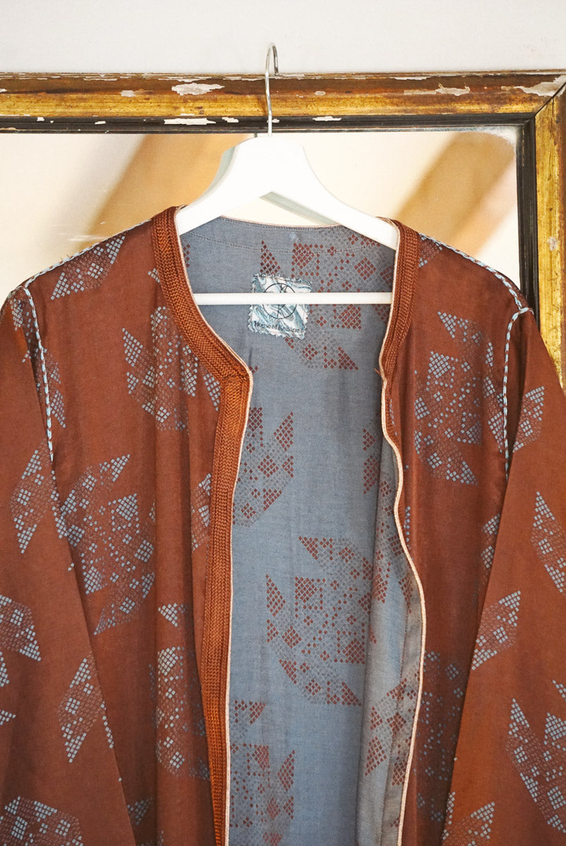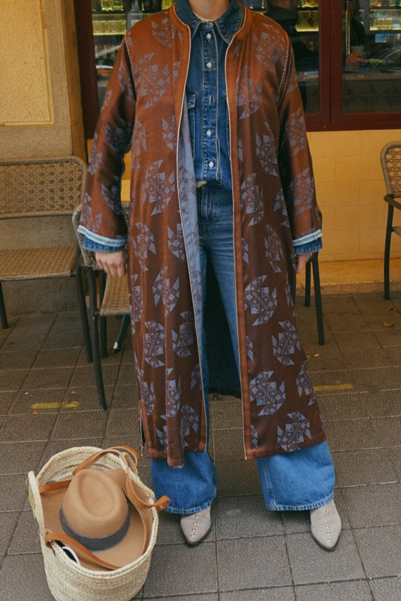 Layer up in Luxe in this chocolate brown oversized kimono. It is here to remind you that layering is an art form. With it's light blue pattern, it’s the perfect blend of laid-back and luxurious. Those side slits with ribbon details? A little extra flair for your every move. And the fabric—soft, sumptuous, and absolutely spectacular.