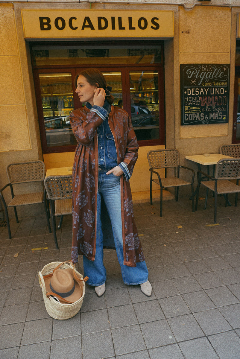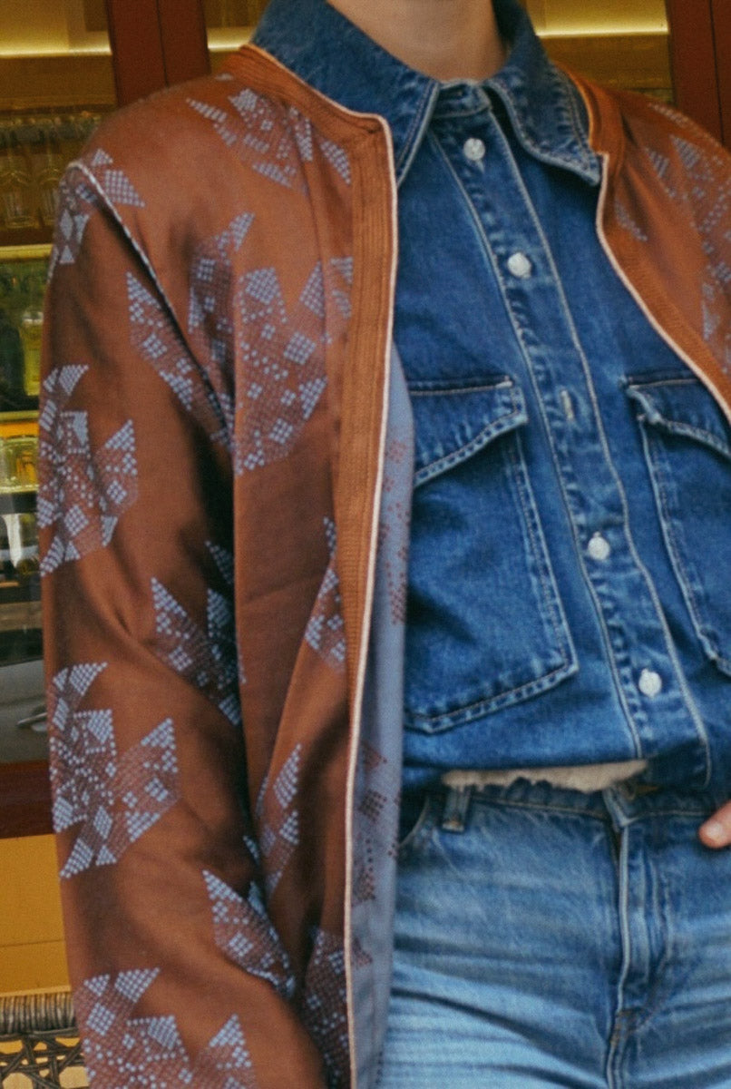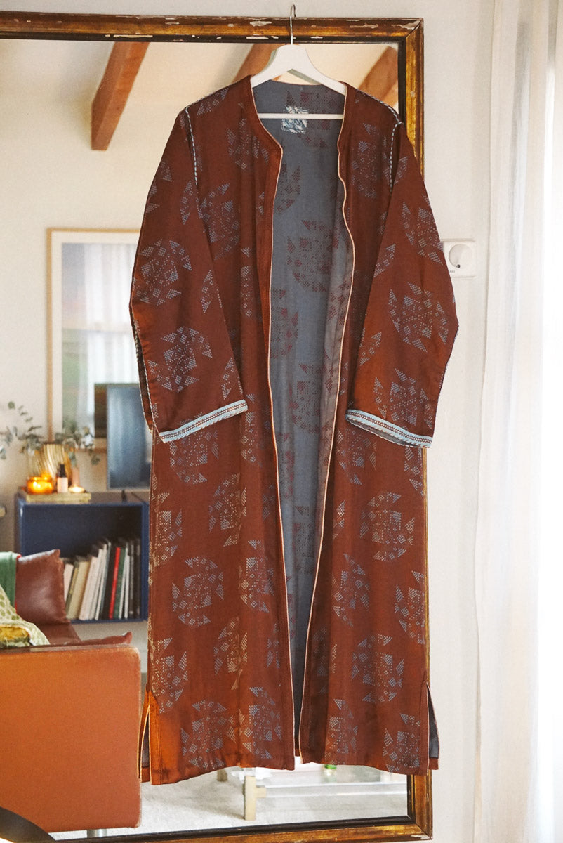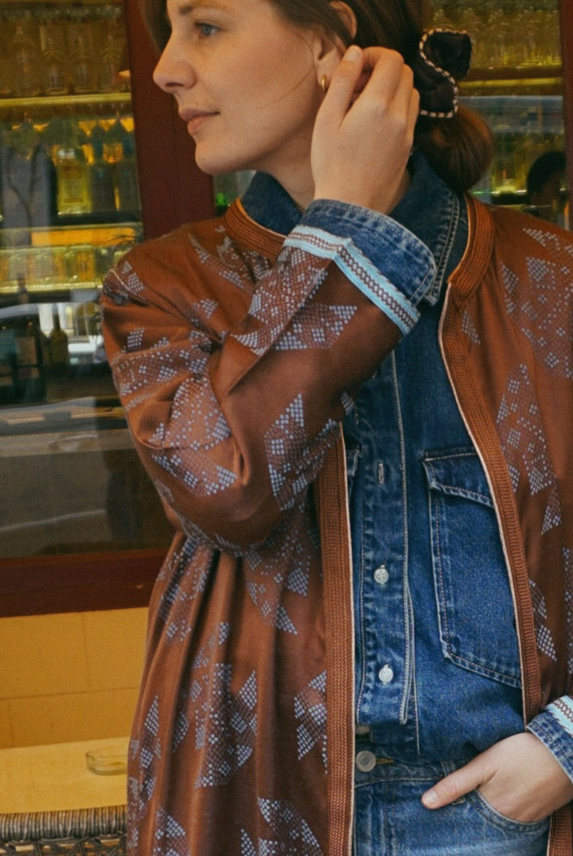 Layer up in Luxe in this chocolate brown oversized kimono. It is here to remind you that layering is an art form. With it's light blue pattern, it’s the perfect blend of laid-back and luxurious. Those side slits with ribbon details? A little extra flair for your every move. And the fabric—soft, sumptuous, and absolutely spectacular.