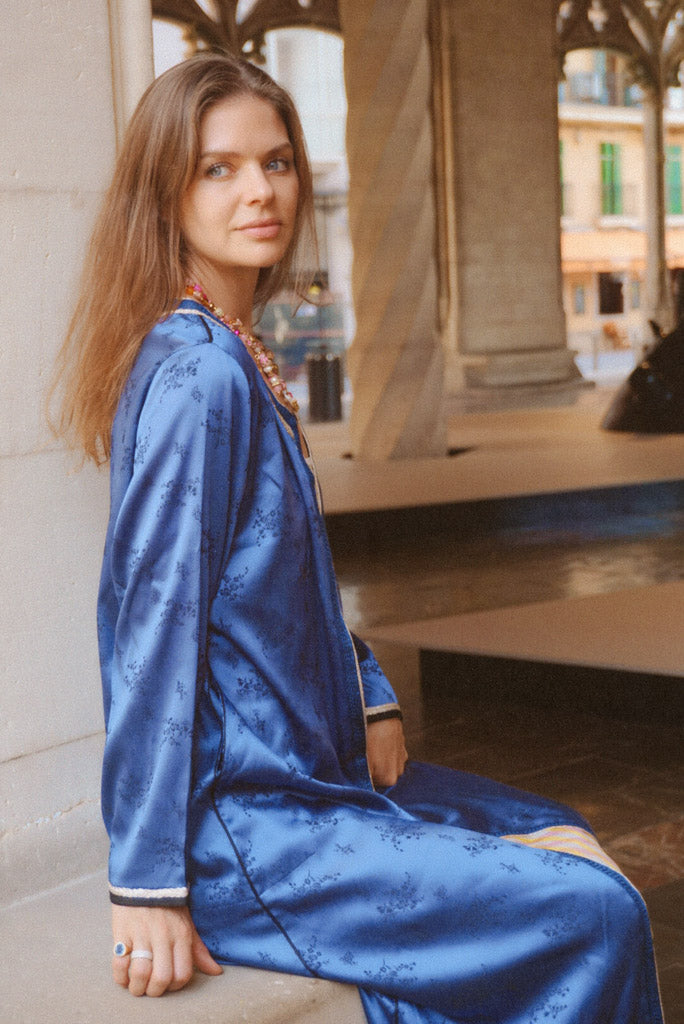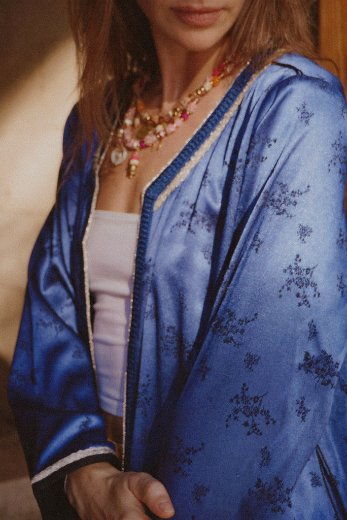 Made from a preloved blue djellaba with a subtle shimmer. Simple, flowing cut for a relaxed fit. Pockets.