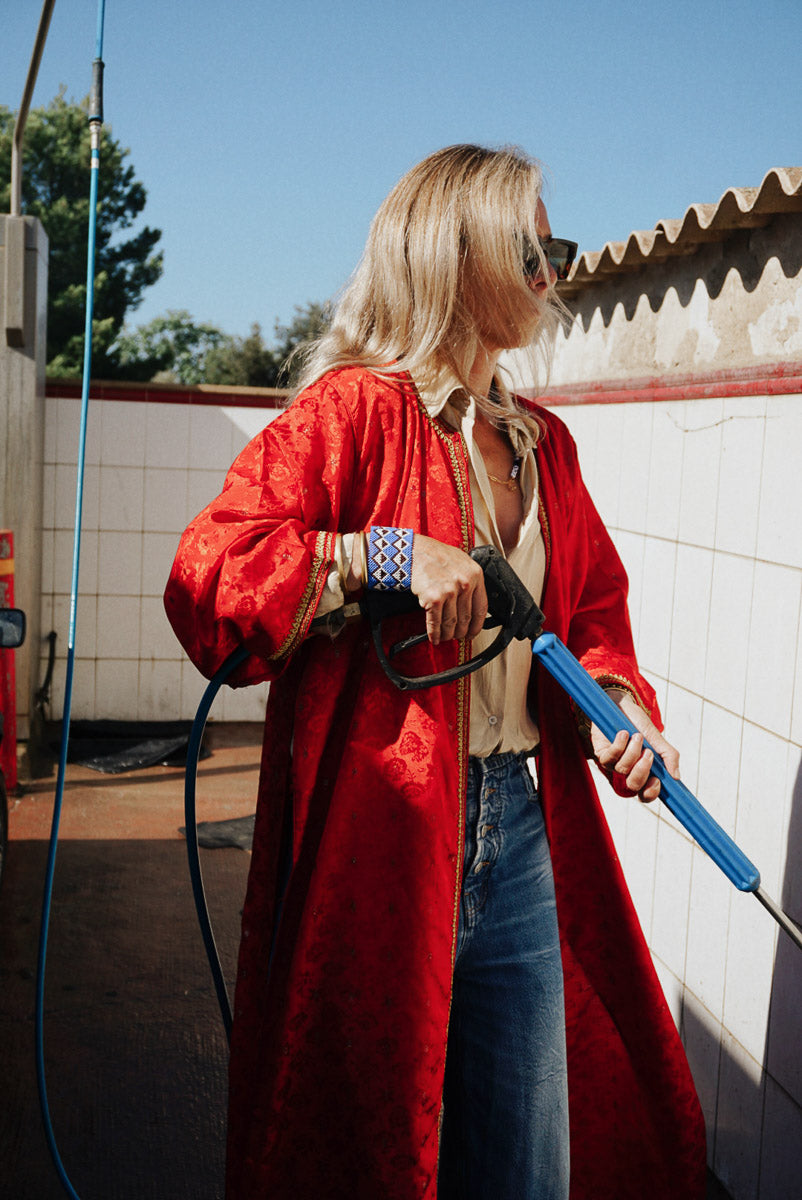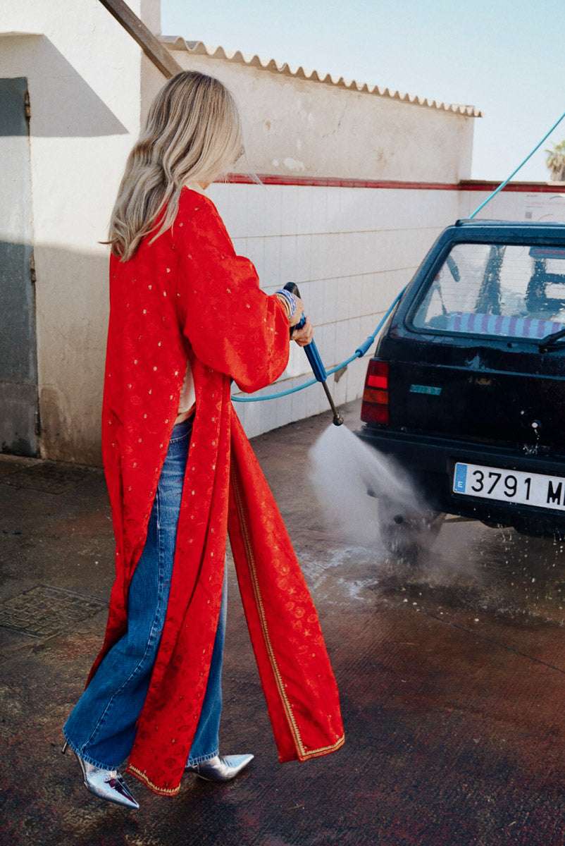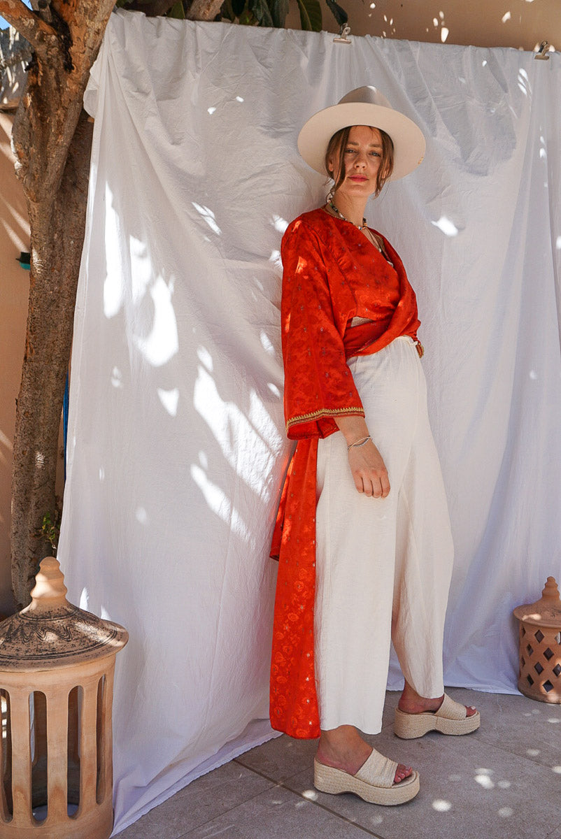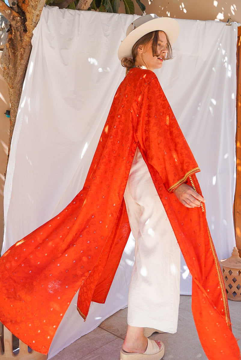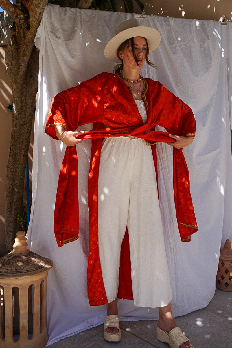 Be noticed in the gorgeous, vibrant Ruby kimono. With red and gold colors, you'll be an eye-catcher and center of attention. Whether you choose to wear it open or wrap it around your waist, it’ll have everyone talking. For the bold woman who knows her worth!