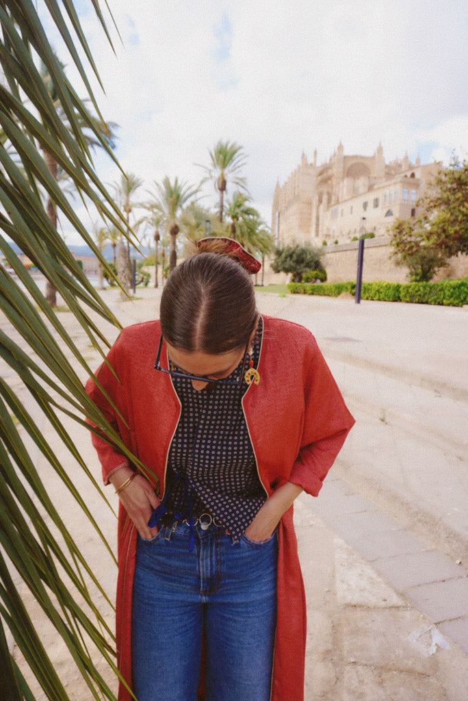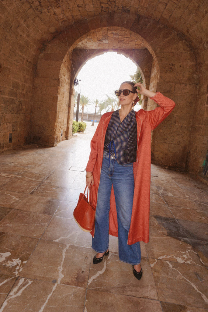 Made from a preloved coral-red djellaba with a subtle shimmer and soft woven texture. Simple, flowing cut for a relaxed fit.