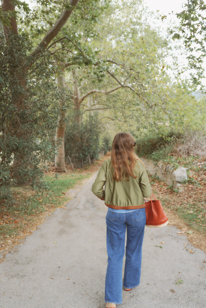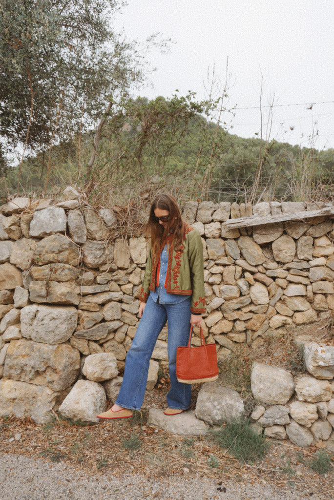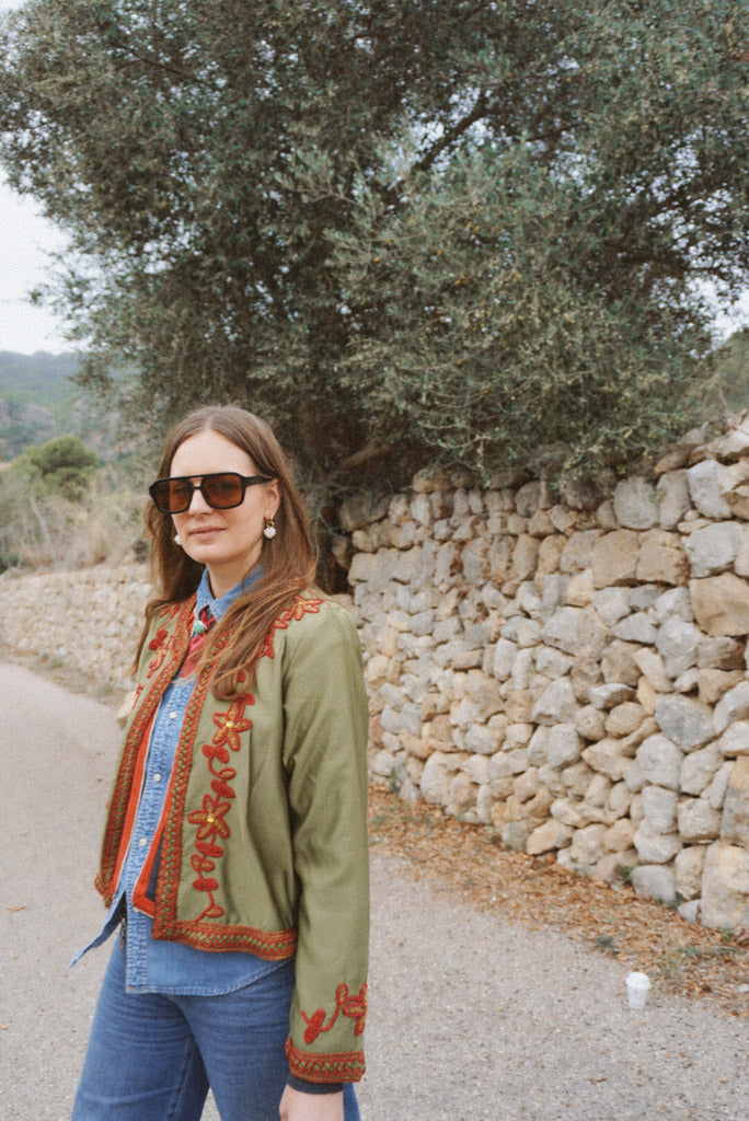 Made from a preloved olive-green djellaba with intricate red embroidery and golden beadwork. Cropped length with a relaxed silhouette.